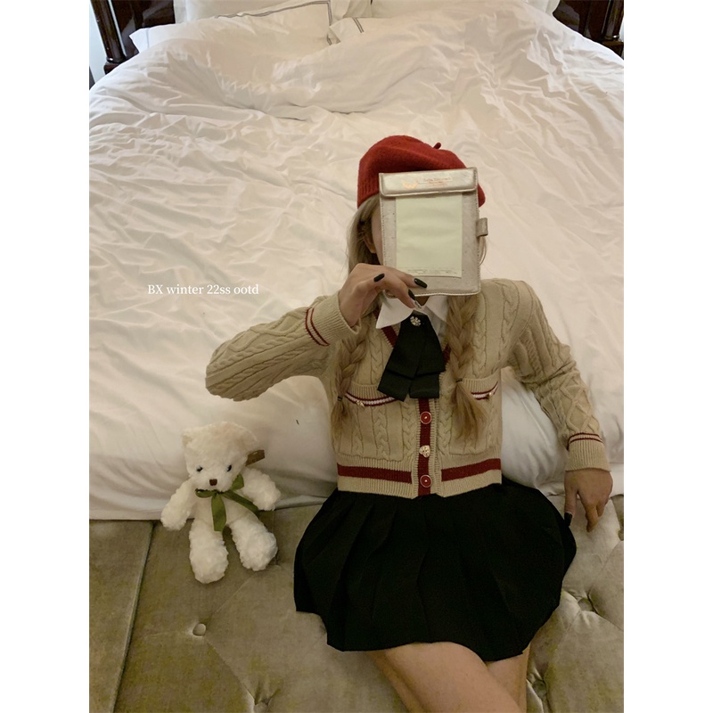 Pakaian Wanita > Set > Set Wanita > ❒◇Suhao Blok Warna Twist Lengan Panjang Kardigan Rajutan Wanita Musim Gugur 2022 Baru Rasa Desain Niche Slim Pendek Jaket Sweater