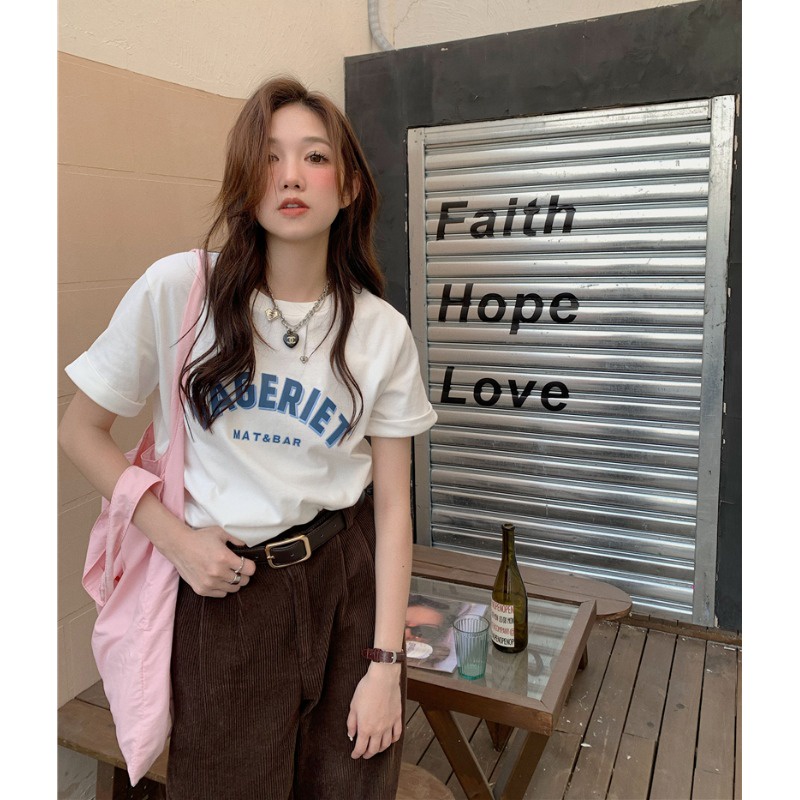 Suhao cetak huruf putih lengan pendek t-shirt wanita musim panas 2023 rasa desain baru ceruk leher bulat longgar atasan kasual kaos impor wanita kaos wanita gaya korea lengan pendek kaos pendek perempuan