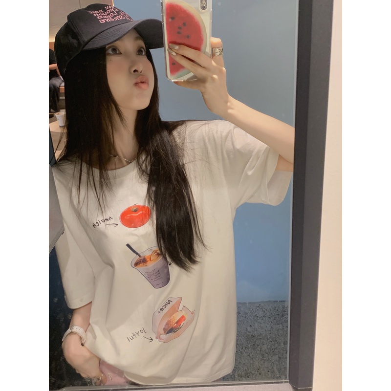 Detail Suhao gaya dasar sederhana bahu cetak putih lengan pendek t-shirt wanita musim panas longgar rasa desain ceruk chic top trendi kaos impor wanita kaos wanita gaya korea lengan pendek kaos pendek perempuan