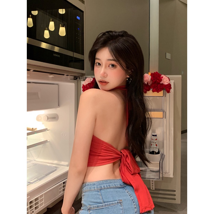 Pakaian Wanita > Atasan > Tanktop & Kamisol > ✱✕№Suhao Halter Leher Kamisol Wanita Ikatan Simpul Musim Panas Pakaian Luar Sexy Hot Gadis Halter Merah Pendek Bagian Dalam Top Crop Top Sexy tank Top Wanita Motif