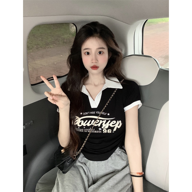 ┋Suhao kaos import wanita kaos wanita gaya korea lengan pendek kaos pendek perempuan polo kerah hitam lengan pendek wanita musim panas American retro t-shirt bahu depan pendek manis hot gadis slim top