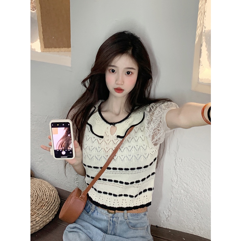 Pakaian Wanita > Atasan > Kaus > □Suhao kaos import wanita kaos wanita gaya korea lengan pendek kaos pendek perempuan gaya Perancis kecil wangi rajutan lengan pendek t-shirt wanita desain musim panas akal ceruk chic bahu depan puff lengan pendek