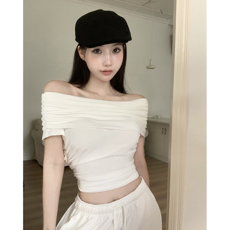 Suhao murni keinginan high-end one-shoulder lengan pendek T-shirt wanita musim panas rasa desain kerumunan kecil slim hot gadis pendek tulang selangka top kaos impor wanita kaos wanita gaya korea lengan pendek kaos pendek perempuan