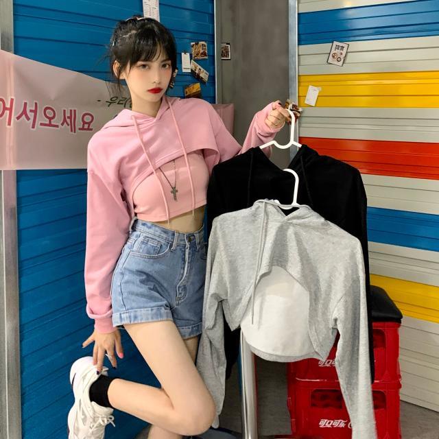 Suhao musim gugur setelan dua potong versi Korea sweater berkerudung abu-abu wanita trendi in longgar angin malas atasan pendek musim gugur