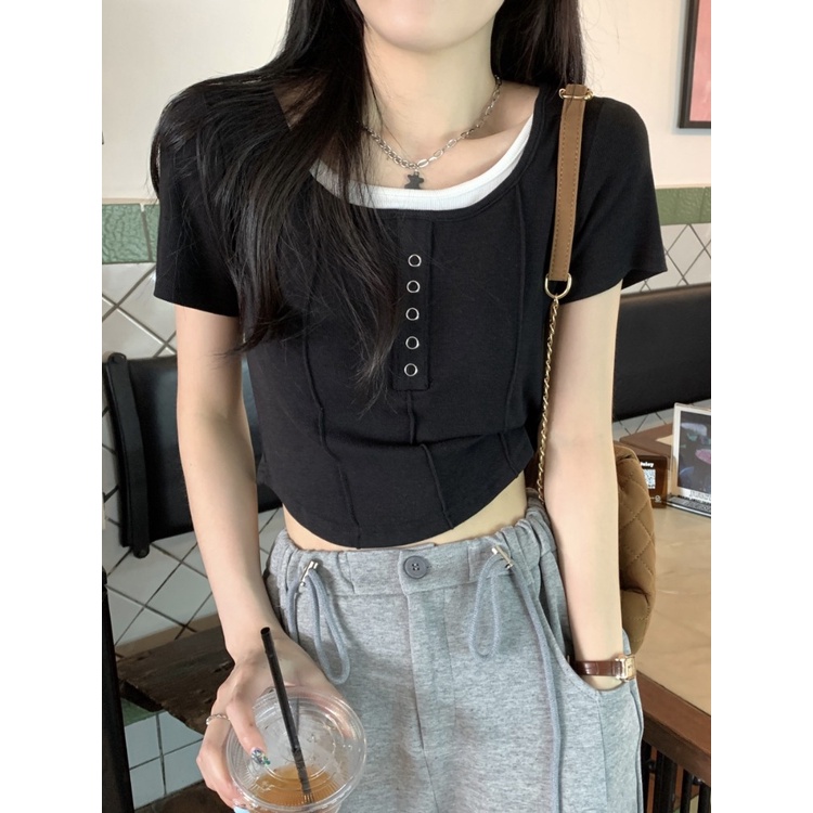 Suhao palsu dua potong warna kontras bahu depan lengan pendek T-shirt wanita musim panas rasa desain ceruk gadis panas tidak teratur American short top kaos impor wanita kaos wanita gaya korea lengan pendek kaos pendek perempuan