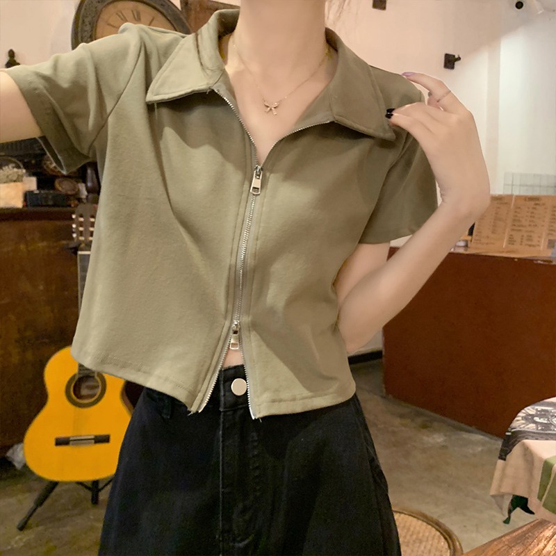 Pakaian Wanita > Atasan > Kaus > Suhao Pendek Bahu Depan Hitam Atasan Wanita Lengan Pendek Musim Panas Longgar dan Desain Ramping Kecil Ritsleting Ganda Kerah Polo T-shirt Kaos Import Wanita Kaos Wanita Gaya Korea Lengan Pendek Kaos Pendek Perempuan