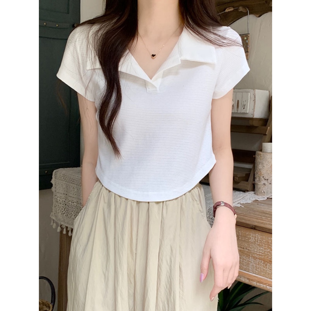 Suhao Pink Polo Kerah Bahu Depan Lengan Pendek T-shirt Wanita Musim Panas Gaya Keinginan Murni Manis dan Pedas Slim Pinggang Tinggi Pendek Atasan Pendek Kaos Import Wanita Kaos Wanita Gaya Korea Lengan Pendek Kaos Pendek Perempuan