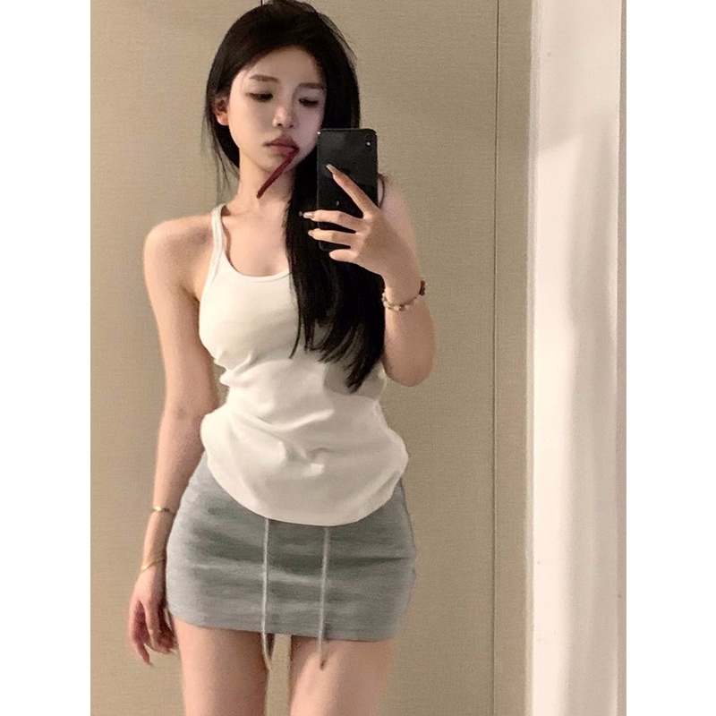 ✖Suhao putih tanpa lengan kamisol wanita setelan busana musim panas rok pinggang tinggi hot girl bag hip skirt short skirt two piece set crop top sexy tank top wanita motif