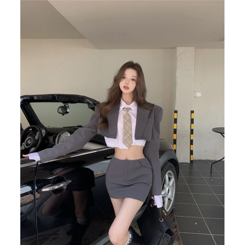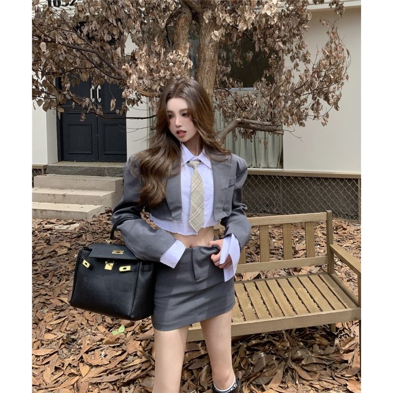 Suhao single piece/set musim gugur goreng jalan temperamen chic jaket jas kecil dengan kemeja pendek perempuan setengah panjang rok pendek