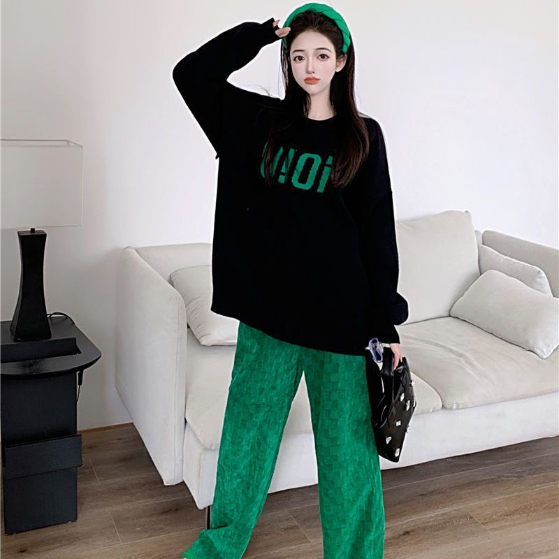 Pakaian Wanita > Set > Set Wanita > Suhao versi Korea longgar leher bulat hitam sweater wanita one-piece suit gaya malas sweater rajutan setengah panjang pakaian luar pullover top