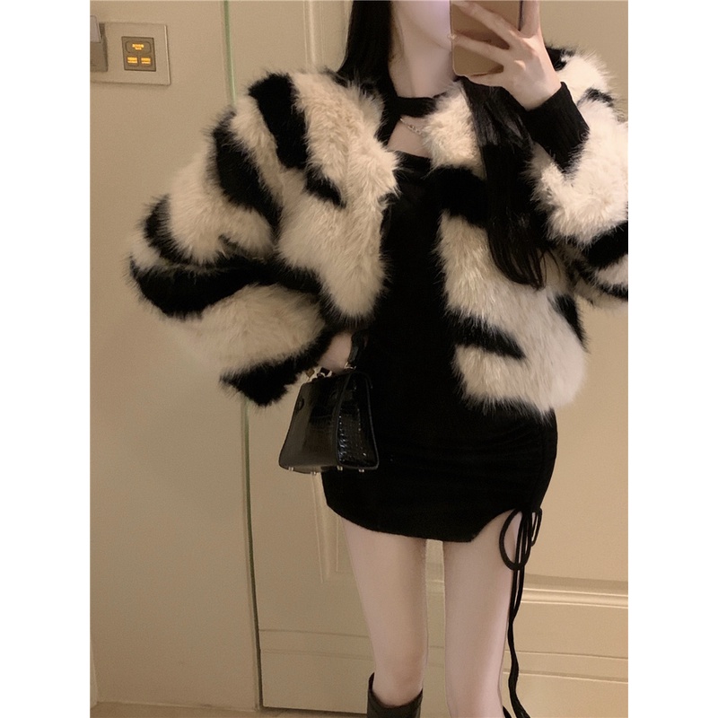 Pakaian Wanita > Set > Set Wanita > ஐSuhao Zebra Pola Imitasi Domba Wol Mantel Musim Dingin Wanita 2022 Baru Longgar Temperamen Rasa Desain Niche Cardigan Top