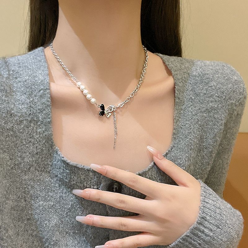 Aksesoris Fashion > Kalung > Suhao zirkon hitam jahitan kupu-kupu kalung mutiara perempuan desain niche manis dan keren rantai tulang selangka in gaya hip-hop aksesoris