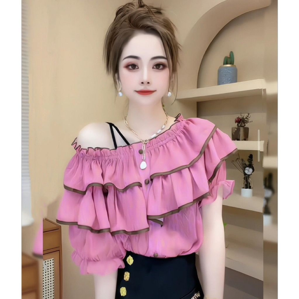 Detail SuhaoBahu Terbuka, Baju Wanita Atasan Anti Penuaan, Kerut2023Kemeja Sifon Bahu Terbuka Mode Musim Pa