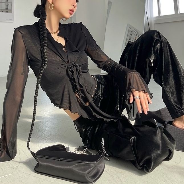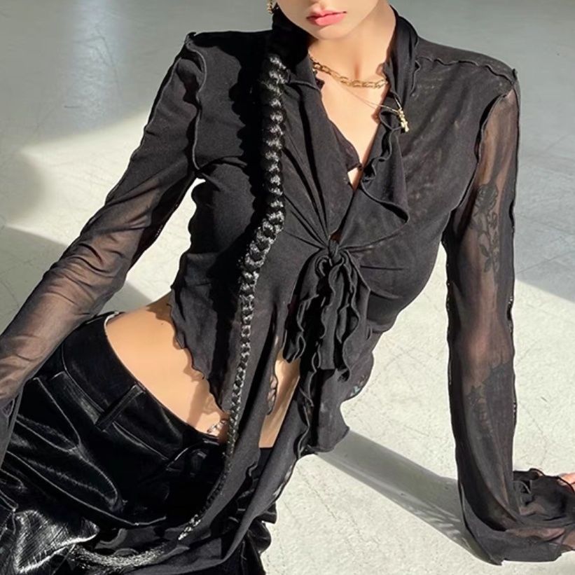 Detail SuhaoLiarzerocircleGauzy Kardigan Wanita Musim Panas Tali Perancis, Atasan Pendek Tembus Pandang Len