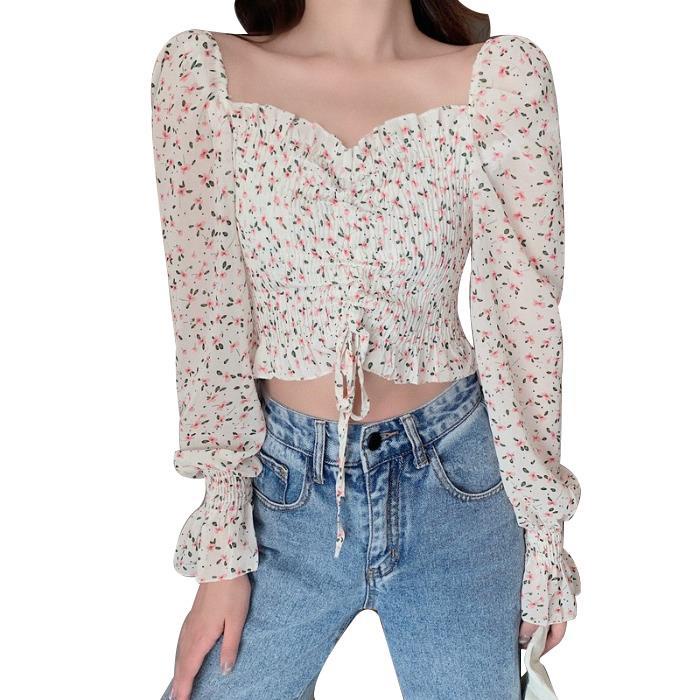 Detail SuhaoPerancis Ungu Bunga Gaya Barat Tali Pendek Midriff-Baring Atasan Wanita Awal Musim Gugur Kemeja