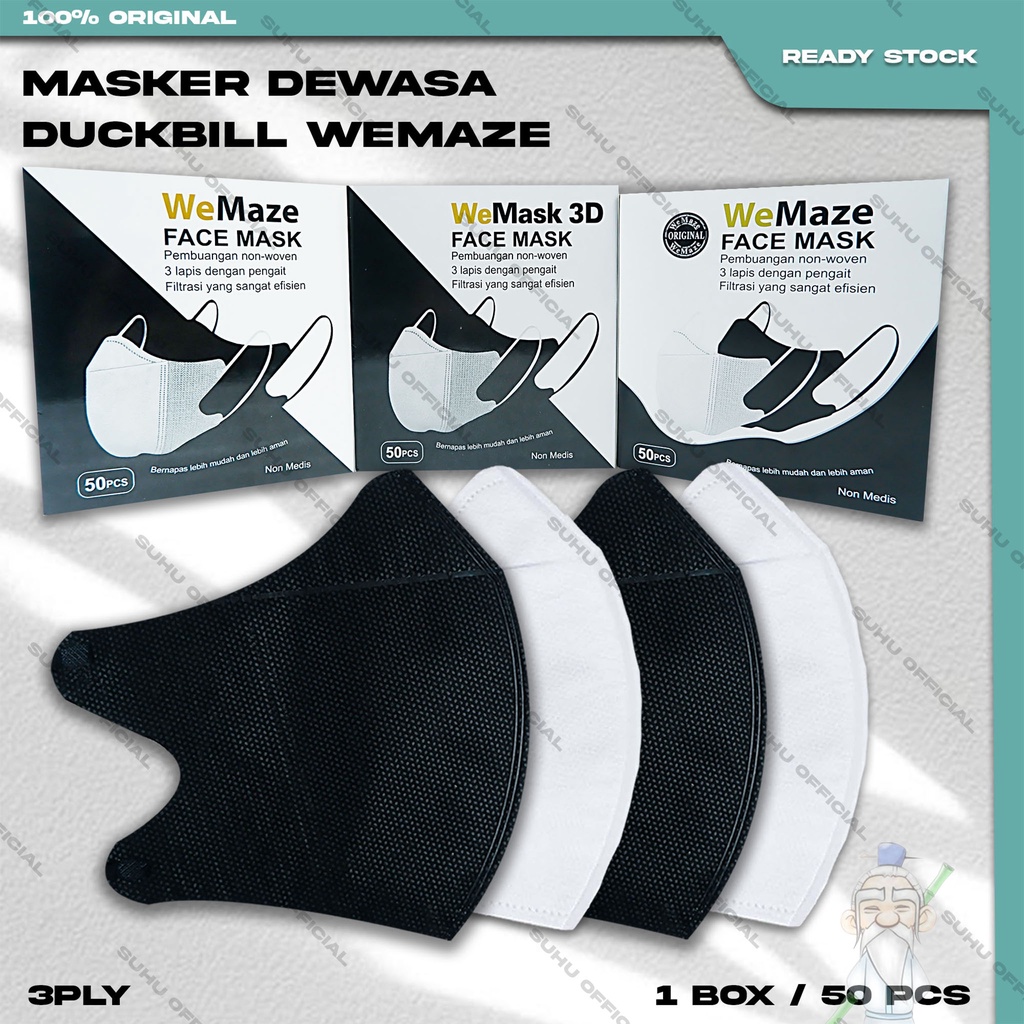 Detail ❤️ SUHU ❤️ Masker Duckbil WEMAZE 3Ply Isi 50Pcs Putih White Duckbill Garis Earloop Surgical Mask