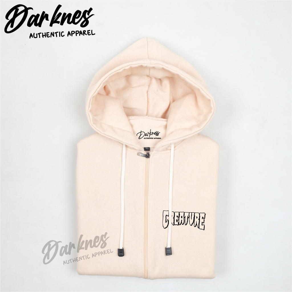 Detail suiter pria hoodie zipper terbaru 2023 keren gaya distro brand darkness apparel warna cream kaki sablon simple creature jaket resleting dewasa laki laki polos jumper jumbo terlaris bisa cod bayar ditempat