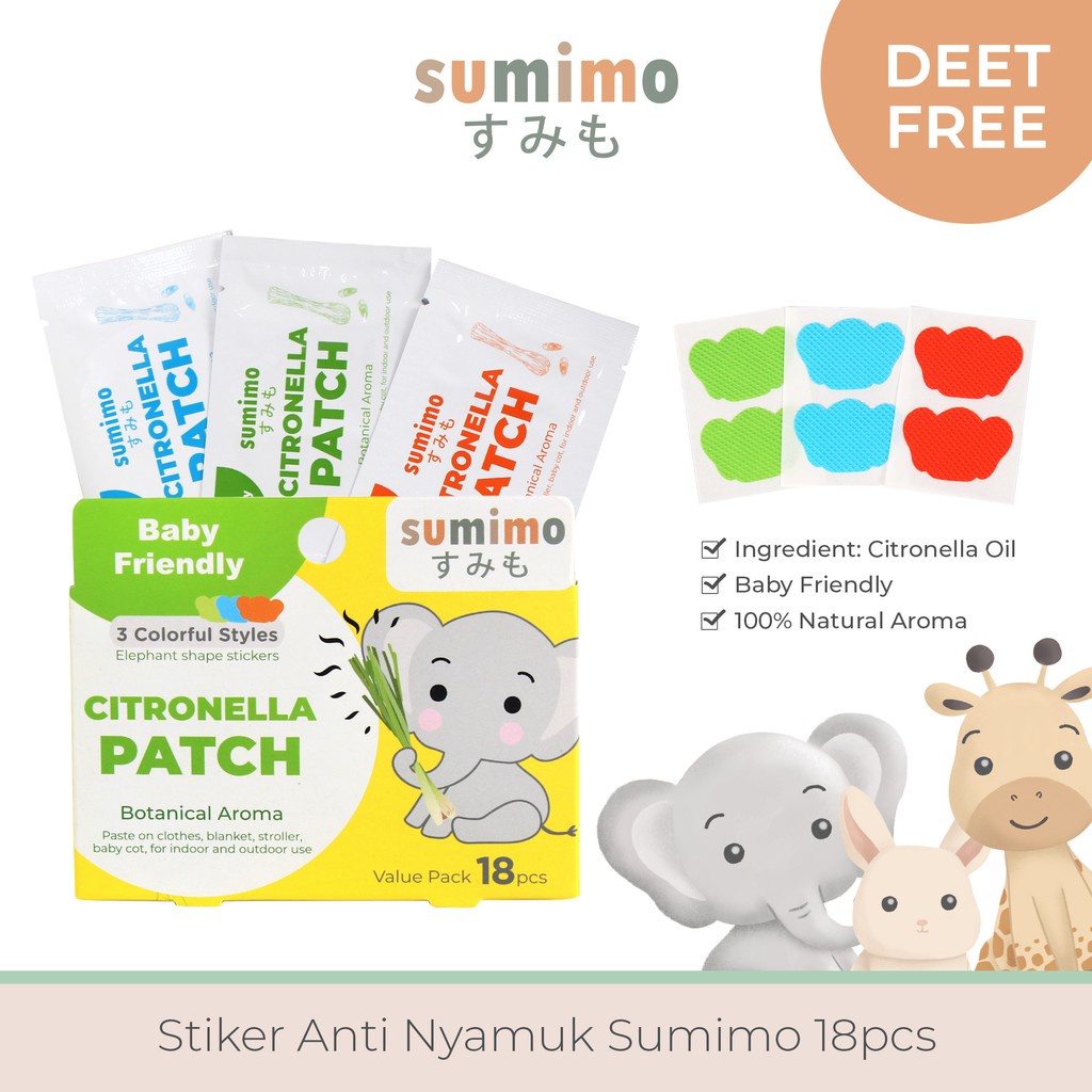 Keunggulan: Dikemas dalam kemasan individual packaging berisi 2 stiker sehingga sticker yang belum dipakai tetap terjaga aromanya. Diformulasi khusus dengan ramuan DEET FREE yang aman untuk bayi dan anak-anak. Sticker Anti Nyamuk Sumimo berbahan lebih tebal dengan stiker 3M dan bahan di embossed sehingga tidak mudah sobek. Aroma natural Citronella lebih efektif mencegah gigitan nyamuk. Sticker dapat menempel untuk waktu yang lama, tidak mudah lepas dan tidak meninggalkan residu lem di pakaian pada saat sticker dilepas. Stiker Anti Nyamuk Sumimo dapat tahan selama 24 jam bahkan lebih, tergantung pada lingkungan.