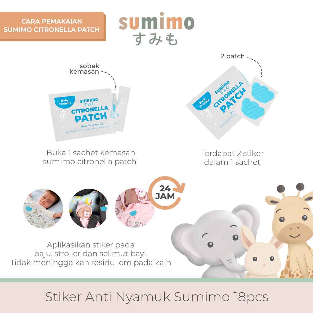 Keunggulan: Dikemas dalam kemasan individual packaging berisi 2 stiker sehingga sticker yang belum dipakai tetap terjaga aromanya. Diformulasi khusus dengan ramuan DEET FREE yang aman untuk bayi dan anak-anak. Sticker Anti Nyamuk Sumimo berbahan lebih tebal dengan stiker 3M dan bahan di embossed sehingga tidak mudah sobek. Aroma natural Citronella lebih efektif mencegah gigitan nyamuk. Sticker dapat menempel untuk waktu yang lama, tidak mudah lepas dan tidak meninggalkan residu lem di pakaian pada saat sticker dilepas. Stiker Anti Nyamuk Sumimo dapat tahan selama 24 jam bahkan lebih, tergantung pada lingkungan.