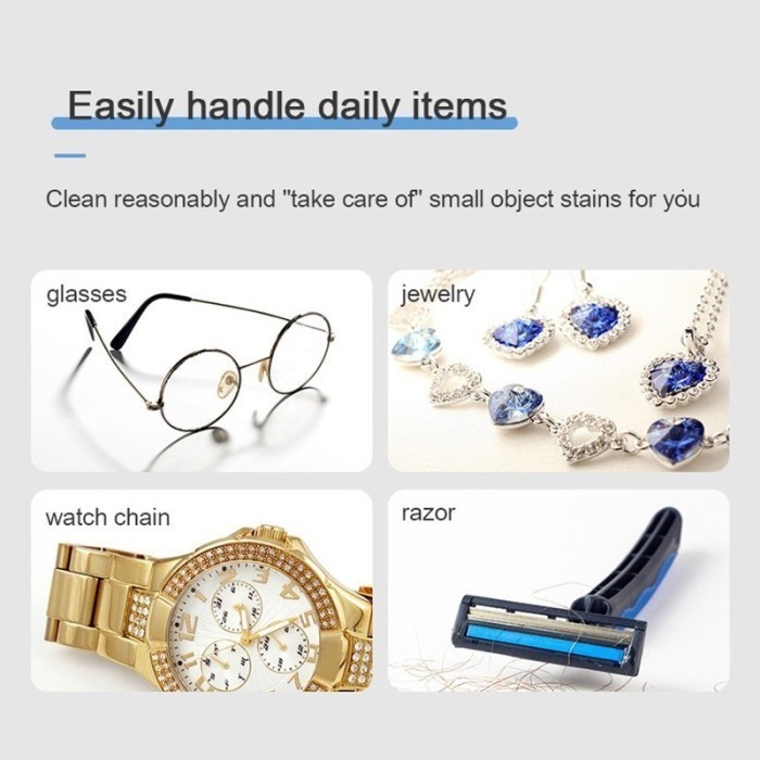 Membersihkan Secara Otomatis Dengan alat ini, Anda sudah tidak perlu lagi membersihkan perhiasan maupun kacamata secara manual. Alat ini sangat otomatis serta praktis. Kotoran yang menempel akan hilang dan membuat perhiasan Anda tampak seperti baru.