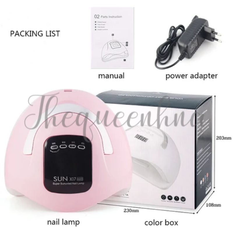 Dalam memilih Uv Led Nail Lamp perlu diperhatikan daya power yg kuat dan juga jumlah lampu, dengan SUN X17 Max 180 W dilengkapi 57pcs lampu led nya lebih hemat waktu hingga 80%,cocok untuk segala jenis kutek, gel nail, gel polish dan acrylic.Kering merata hanya dalam hitungan detik,sangat efektif dan tidak menimbulkan rasa sakit/kepanasan