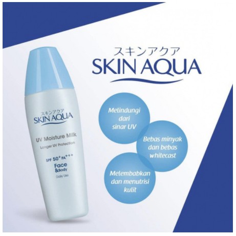 Cara penggunaan - Bersihkan wajah dengan sabun wajah, kemudian keringkan. - Tuangkan Skin Aqua secukupnya pada telapak tangan, kemudian aplikasikan di wajah secara lembut hingga meresap. - Setelah itu, gunakan make up seperti biasa. - Untuk hasil yang optimal, gunakan setiap hari dan aplikasikan kembali jika kulit terkena keringat, terkena air atau jika terkena sinar matahari dalam jangka waktu yang lama.