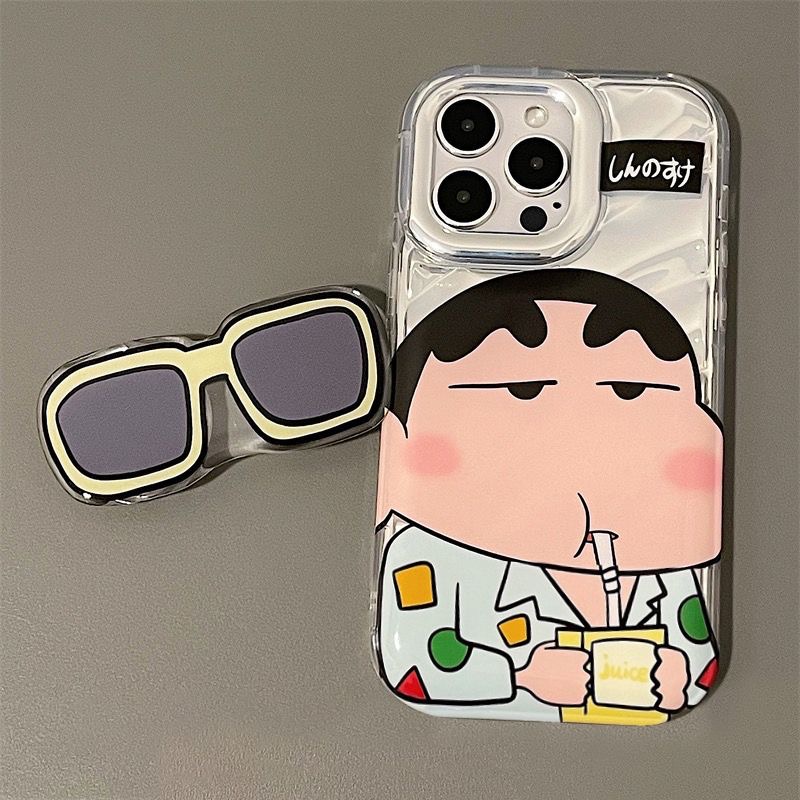 【Sunglasses Shin-chan】Cool Laser Wave Gradient Silver Airbag SoftCase IPhone 11 12 13 14 Pro Max X XR XS MAX 14 Plus Protect Case girl women's Fashion Cute Phone Case
