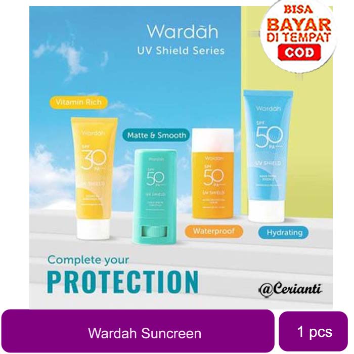 π Wardah UV Shield Aqua Fresh Essence SPF 50 PA++++ (30mL) π Wardah UV Shield Active Protection Serum SPF 50 PA++++ (35mL, waterproof π Wardah UV Shield Essence Sunscreen Gel SPF 30 PA+++ (40mL) π Wardah UV Shield Light Matte Sun Stick 22 g