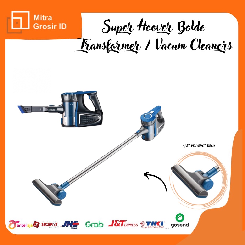 BOLDe Super Hoover Transformer adalah Wireless Vacuum Cleaner atau penyedot debu tanpa kabel, yang memudahkan Anda untuk lebih leluasa membersihkan kotoran di berbagai ruangan. Dalam pengoperasiannya, Super Hoover Transformer menggunakan Baterai Li-Ion (Ion Litium) dengan kapasitas baterai 2000mAh, yang memiliki kepadatan daya lebih tinggi sehingga kekuatan baterai lebih lama dan dapat digunakan 20 menit – 40 menit. Tersedia 2 pilihan mode kecepatan dengan hisapan yang kuat hingga 10 KPa sehingga dapat membersihkan lebih cepat dibanding vacuum cleaner biasa. Dilengkapi 2 aksesoris yaitu sikat yang dilengkapi dengan roda dan smart lamp, sehingga debu pada permukaan dapat terlihat lebih jelas. Serta pipa yang lebih pipih sehingga dapat menjangkau sela-sela pada sofa atau tempat yang sulit dijangkau.