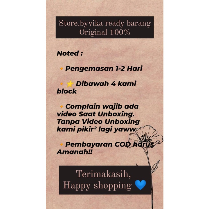 Noted : 🔸Pengemasan 1-2 Hari 🔸⭐ Dibawah 4 kami block 🔸Complain wajib ada video Saat Unboxing. Tanpa Video Unboxing kami pikir² lagi yaww 🔸Pembayaran COD harus Amanah!!