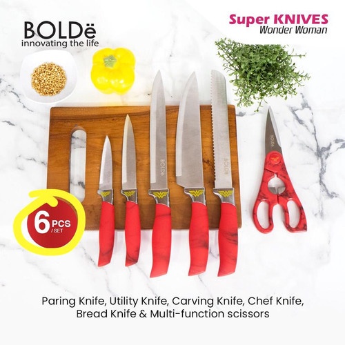 BOLDe Super Knive Set Wonder Woman Tempered Stainless Steel Set pisau terbuat dari besi baja stabiles steel yang sudah diperkuat untuk anti karat, tahan lama, dan ketajaman produk lebih lama. Athena Cutting Technology Teknik pemotongan mata pisau V-shaped yang sangat tajam memberikan kemudahan dalam memotong secara halus, cepat, dan mudah. Premium Wonder Grip Gagang pisau yang panjang dengan bahan marbel yang lembut telah disesuaikan dengan system ergonomi tangan sehingga anda dapat memotong lebih kuat dan lebih panjang. 6 Daily Essentials use Bolde X Wonder Woman Knife Set dilengkapi dengan 5 jenis dan 1 gunting multifungsi untuk segala jenis kebutuhan memotong. Di dalam box: Terdapat 6 set pisau: Chef Knife, Bread Knife, Carving Knife, Utility Knife, Paring Knife, Multi-function scissors (scissors, bottle opener, walnut clip)