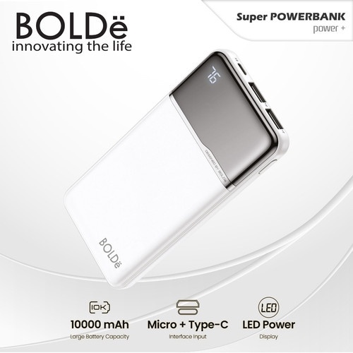 BOLDe Super Power Bank POWER+ LCD Powerbank Power + BOLDe didesign dengan Ultra-tipis dan berukuran kompak yang dilengkapi dengan indikator battery LCD. Kapasitas tinggi 10000mAh dapat mengisi daya ponsel pintar 3 kali, dan kompatibel dengan lebih dari 99% perangkat elektronik cerdas di pasaran. Design yang ultra-tipis dan ringan sehingga dapat dibawa-bawa, dapat dengan mudah dimasukkan ke dalam saku pakaian, nyaman untuk Anda di mana saja . Tempat dapat mengisi daya ponsel Anda untuk penggunaan sehari-hari, jadi Anda tidak perlu khawatir kehabisan daya. Pengisian kecepatan tinggi: Teknologi pengisian kecepatan tinggi dengan voltase 5V / 2.1A dapat dengan cepat mengisi penuh perangkat Anda, dua mode input (Tipe-C USB / Mikro) input 5V / 2A dapat dengan cepat mengisi daya ponsel. Smart LCD digital display, ketika Anda menekan tombol samping akan secara akurat menampilkan persentase baterai yang tersisa. Saat mengisi daya, Anda dapat secara akurat mengamati status baterai dan mengetahui saat sudah penuh. Berbagai perlindungan keamanan: penggunaan baterai lithium-ion berkualitas tinggi, built-in dengan berbagai sistem keamanan cerdas yang telah melalui tes profesional dan inspeksi manual, peralatan dapat dilindungi dari pengisian daya yang berlebihan , panas berlebih, tegangan lebih, arus lebih dan mencegah korsleting.