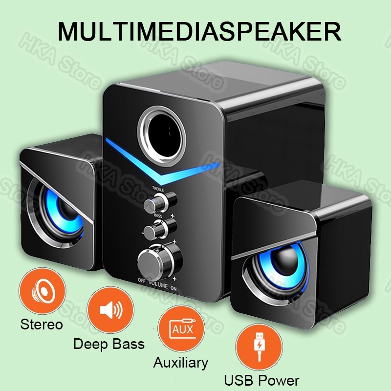 Fitur: 1. Sistem Speaker 2.1 yang Kuat: Speaker 2W ganda dan subwoofer 3W. Dibandingkan dengan speaker kecil lainnya, set speaker mini ini menghasilkan suara stereo yang kaya dan jernih. 2. Treble dan Bass: Kombinasi cerdas dari speaker independen treble dan bass menciptakan suara surround stereo 9D dan memungkinkan Anda menikmati efek suara tingkat bioskop. Hal ini dapat disesuaikan secara mandiri. 3. Dengan Lampu LED: Speaker komputer 2.1 ini memiliki pencahayaan biru lembut, yang meningkatkan suasana untuk menonton film atau video, mendengarkan musik, dan bermain game. 4. Kontrol Knob: Untuk mencapai kualitas suara HiFi yang sebenarnya, atur total volume, treble, dan kenop penyesuaian bass di samping speaker utama. Anda dapat menyesuaikan musik dalam gaya yang berbeda sesuai dengan kebutuhan dan preferensi Anda. 5. Kompatibilitas Luas: Mendukung koneksi kabel dan kompatibel dengan Bluetooth, cocok untuk komputer, ponsel, notebook, dan lebih banyak perangkat yang memiliki antarmuka USB atau antarmuka audio 3.5mm.