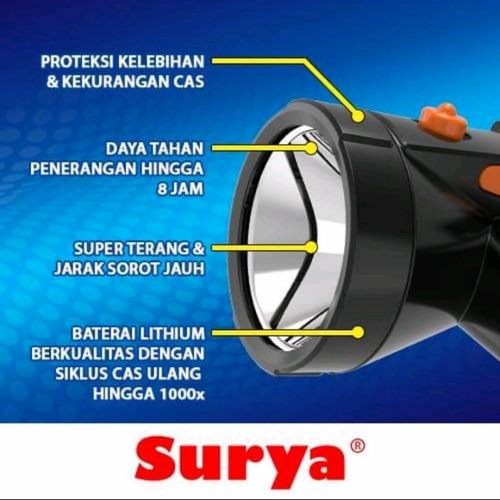Merek Surya Type SYH L105B Cahaya Putih Tipe LED Rechargeable Baterai Cas ulang kapasitas besar Lithium 3.7V 1800mAh Ketahanan 8 Jam Proteksi kekurangan dan kelebihan cas Menggunakan Super Led 10 Watt yang tahan lama dan sangat terang Cahaya Terang, Kedap Kedip dan Dim Dilengkapi Kabel Cas dan Tali Strap Water Resistant 10 Watt Kualitas terbaik Garansi Resmi Barang Original