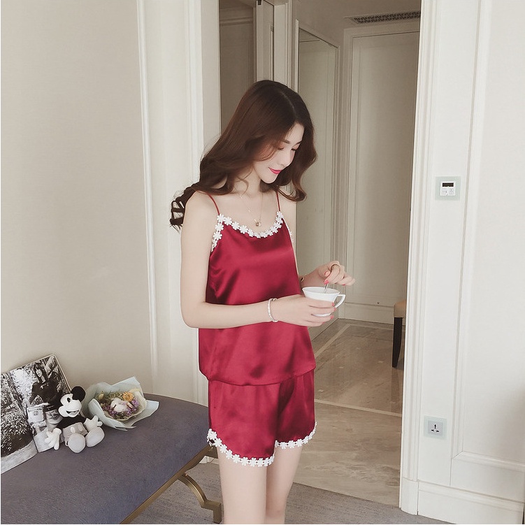 Detail Suspensor rompi sutra es piyama sutra seksi celana pendek dua potong pakaian rumah