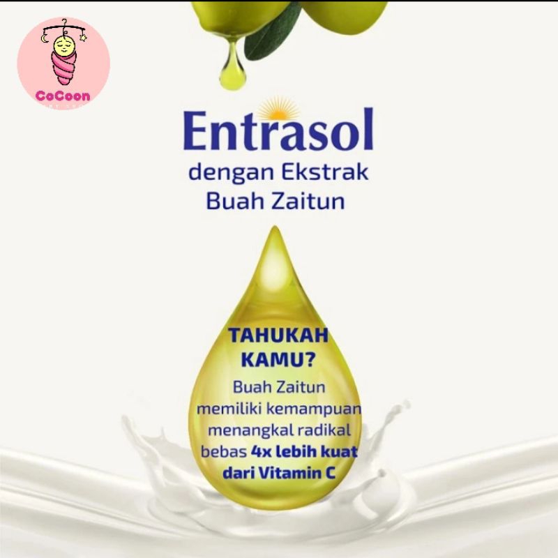 Entrasol merupakan susu nutrisi tinggi kalsium dengan ekstrak buah zaitun dilengkapi dengan Pro-Fit Formula (Omega 3 dan 6, Tinggi Kalsium dan Vitamin D, Tinggi Serat, 10 Vitamin dan 5 Mineral) serta lebih rendah gula untuk membantu penuhi nutrisi harian agar tetap aktif dan fit serta memperlambat terjadinya osteoporosis.