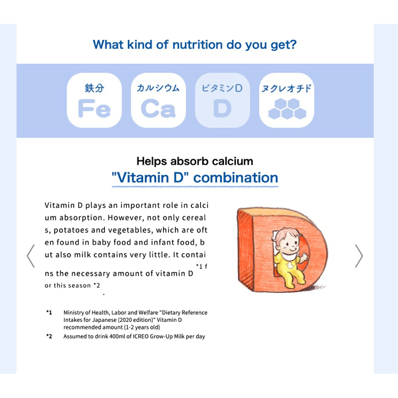 Untuk Bayi 12 bulan keatas Originating from an infant formula developed by a group of pediatricians The origin of ICREO's milk is an infant formula developed in 1913 by a group of pediatricians who aspired to create "a formula close to breast milk that works best for babies." Since its release, ICREO has been working to develop infant formula closer to breast milk, which is the ideal nutrition for babies, under our consistent and strict quality control.