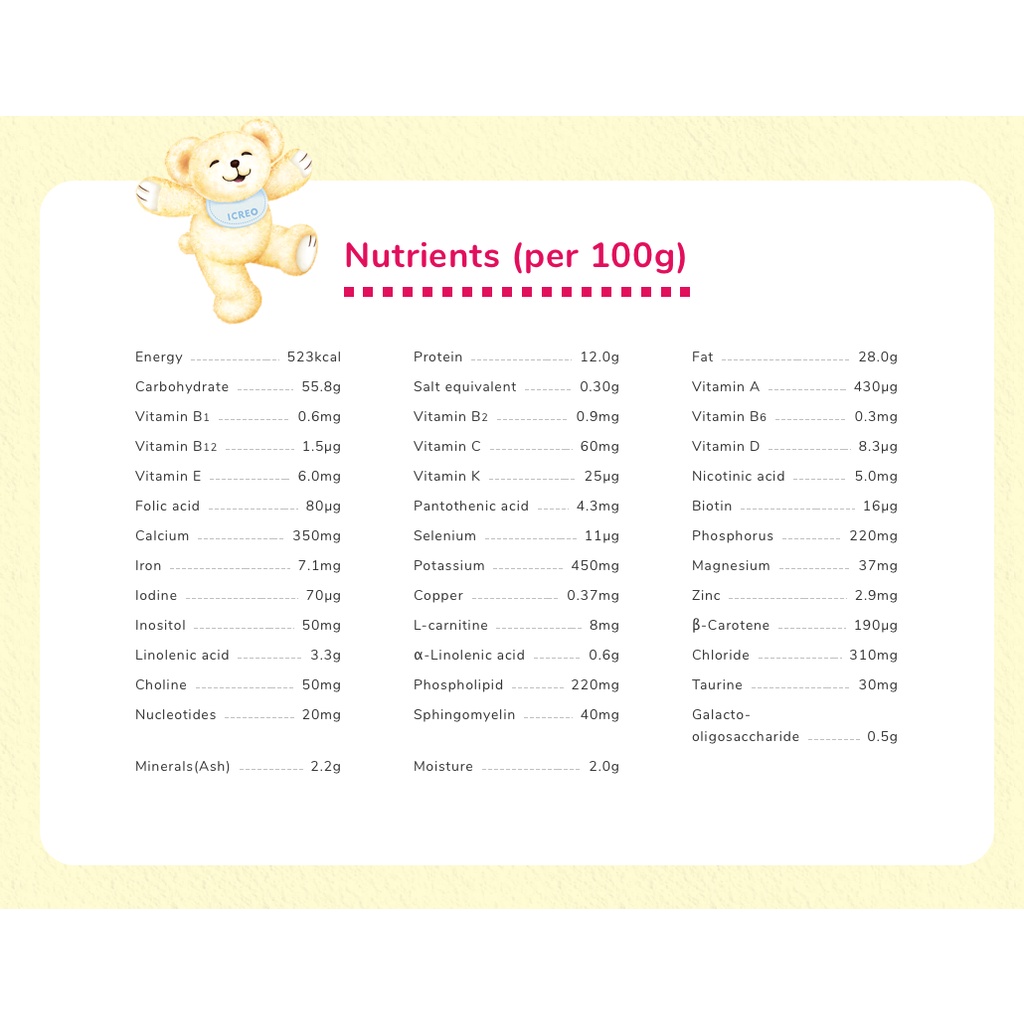 This milk formula is a well-balanced source of calcium, iron and vitamin D to provide optimal nutrition and facilitate the transition from milk to solid food. This baby milk has been prepared using a combination of Hokkaido and/or USA milk, Hokkaido's milk is known in Japan for its high quality and pureness. Main features Made in Japan using advanced technology and rigorous quality assurement process. Careful balance of vitamins and iron to help the child grow. Allergenic information : Shrimp-No Crab-No Wheat-No Buckwheat- No Egg-No Milk-Yes Peanut-No