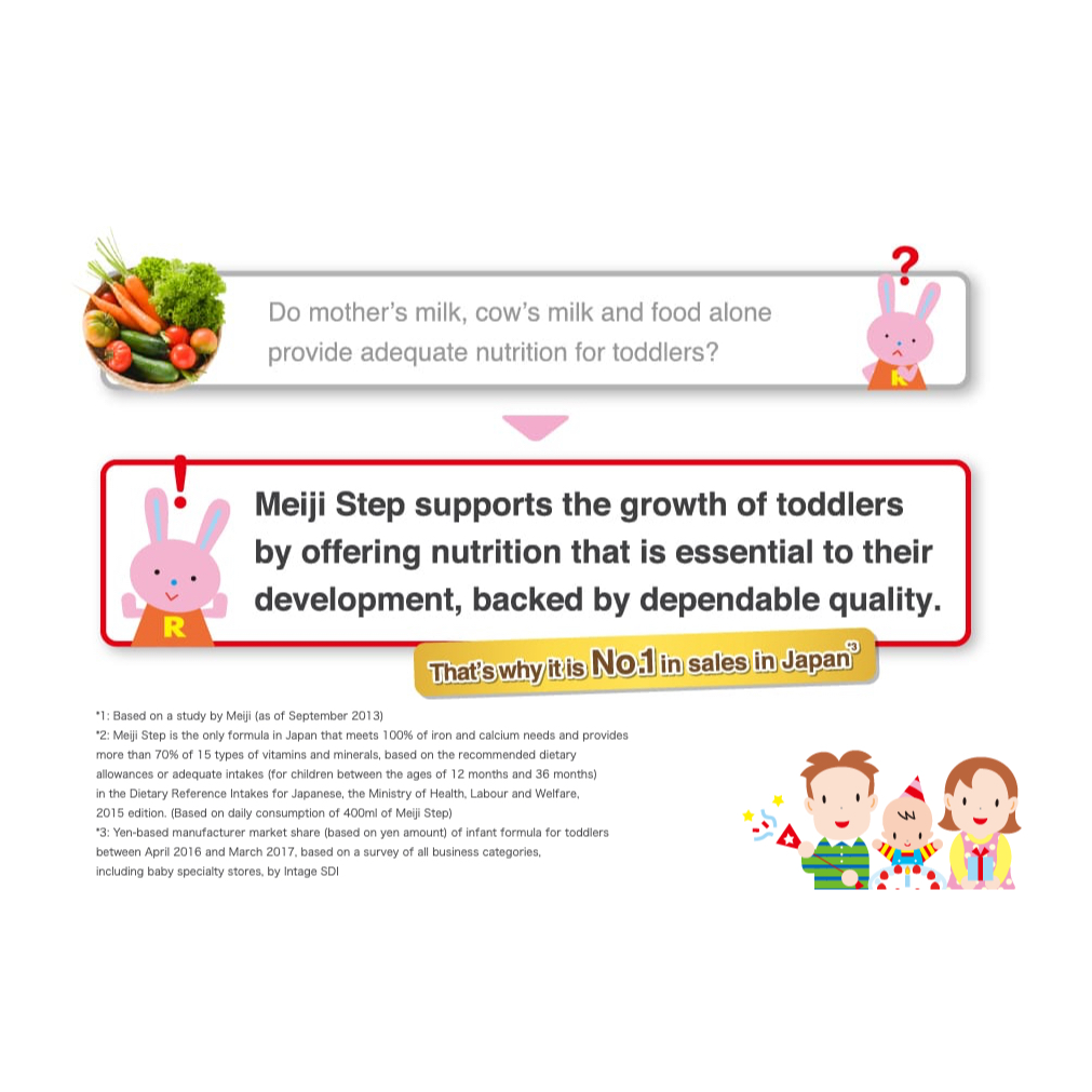 Susu Meiji Step 1 - 3 dengan formula casein dan whey protein yang mendekati kecocokan dengan air susu Ibu. Susu Meiji memiliki formula DHA dan ARA yang membuat susu Meiji terkenal di kalangan ibu-ibu di Jepang.