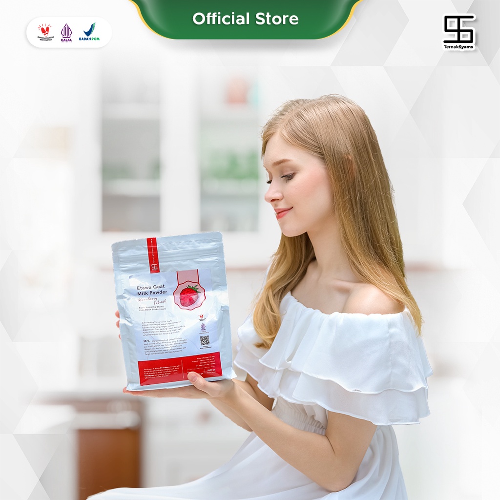 100% HALAL LPPOM 12040002540519 Premium Susu Kambing Etawa Bubuk Ternak Syams Susu Kambing Etawa Bubuk Rasa Buah Stoberi Netto 1000 gram / 1 Kg Expired : 1 tahun setelah kemasan dibuka