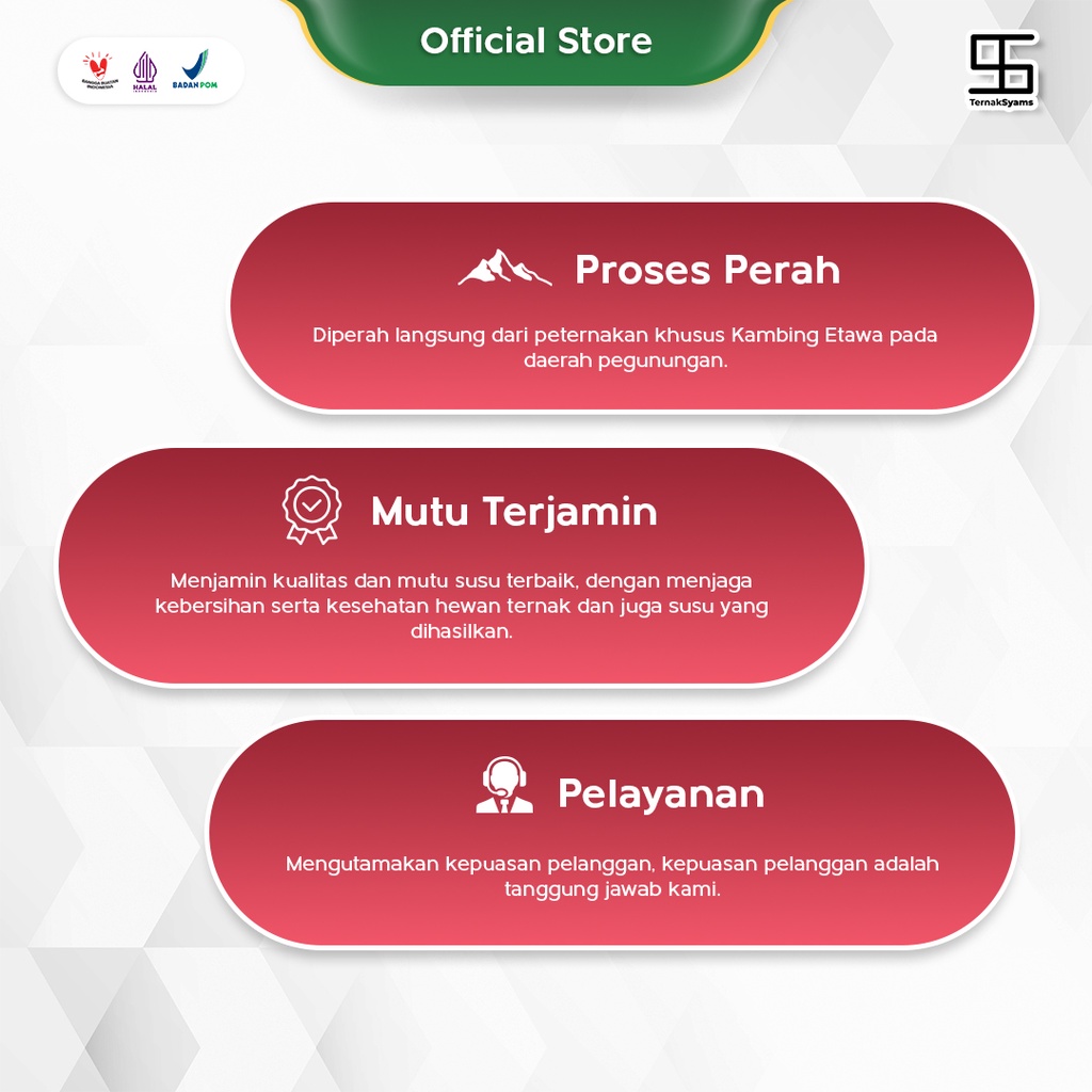 Kelebihan Susu Kambing Etawa Bubuk Ternak Syams : 1. Tidak ada aroma prengus, nyaman di konsumsi. 2. Dapat di konsumsi penderita diabetes, kolestrol atau sedang diet, maksimal 2x sehari. 3. Tidak mengandung bahan tambahan lain, selain susu kambing dan hanya non dairy creamer saja. 4. Hanya produksi dari susu kambing etawa asli yang berkualitas baik, kami cek selalu kualitasnya. 5. Di olah langsung dari peternakan kambing Ternak Syams, kualitas dan mutu susu kambing etawa terjaga. 6. Di proses melalui teknologi canggih Try Dryer, di olah tanpa mengurangi kandungan gizi dan manfaat susu kambing etawa. Susu Kambing Etawa Ternak Syams akan lebih terasa manfaat dan khasiat nya. 7. Melalui proses pengolahan produksi yang steril dan sesuai dengan ketentuan BPOM. 8. Kualitas dan mutu produk susu kambing etawa bubuk selalu di perhatikan dan di kembangkan, kami berikan yang terbaik agar customer mendapatkan produk berkualitas terbaik. 9. Mengutamakan Kepuasan Pelanggan, karna Kepuasan Anda adalah Tanggung Jawab kami.