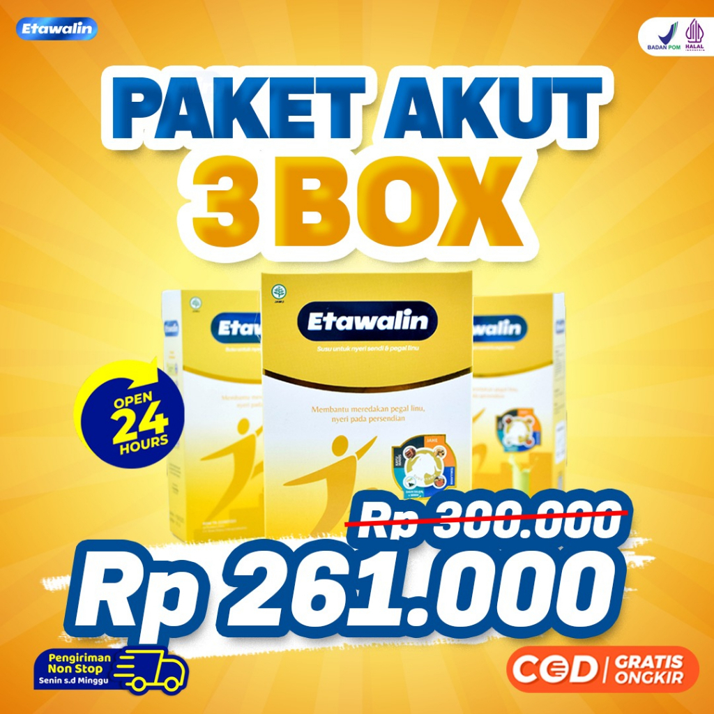Jangan khawatir! Kami merekomendasikan Etawalin Etawalin adalah minuman susu yang terbuat dari susu kambing etawa asli yang dipadukan dengan 5 herbal alami yang diciptakan khusus untuk penderita reumatik, nyeri sendi, hingga asam urat dan sangat berguna untuk meningkatkan kesehatan dan kepadatan tulang.