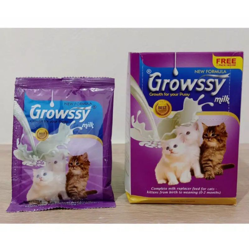Growssy milk adalah susu lengkap dan mudah dicerna serta rendah laktosa. Cocok diberikan sebagai susu pengganti untuk anak kucing dan suplemen untuk indukan menyusui, kucing yg sudah tua maupun kucing sakit. Mengandung antioksidan komplex termasuk Vit.E dan C, lutein, taurin dan oligosakarida mannam mendukung sistem kekebalan tubuh pada perkembangan anak kucing.