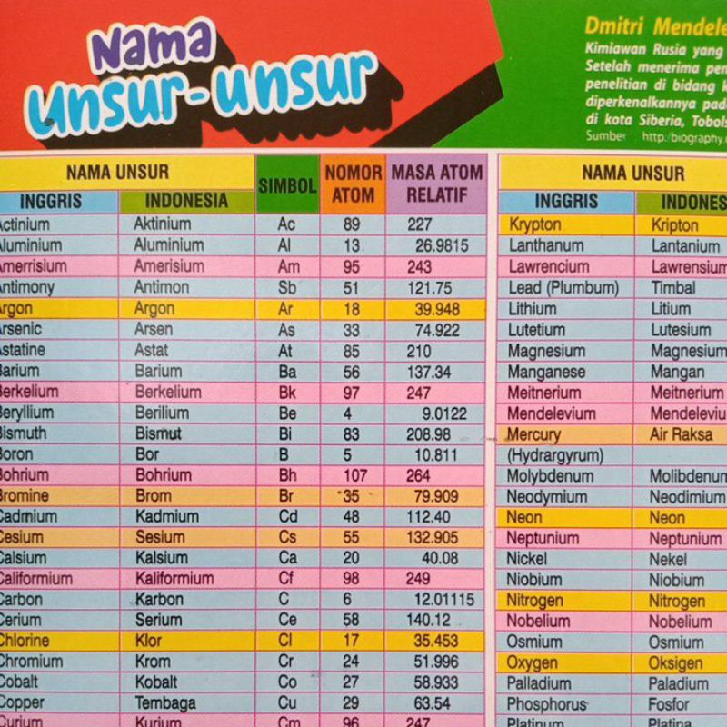 Berisi Nama Unsur-unsur dalam bahasa Inggris Indonesia, Simbol, Nomor Atom, Masa atom relatif.