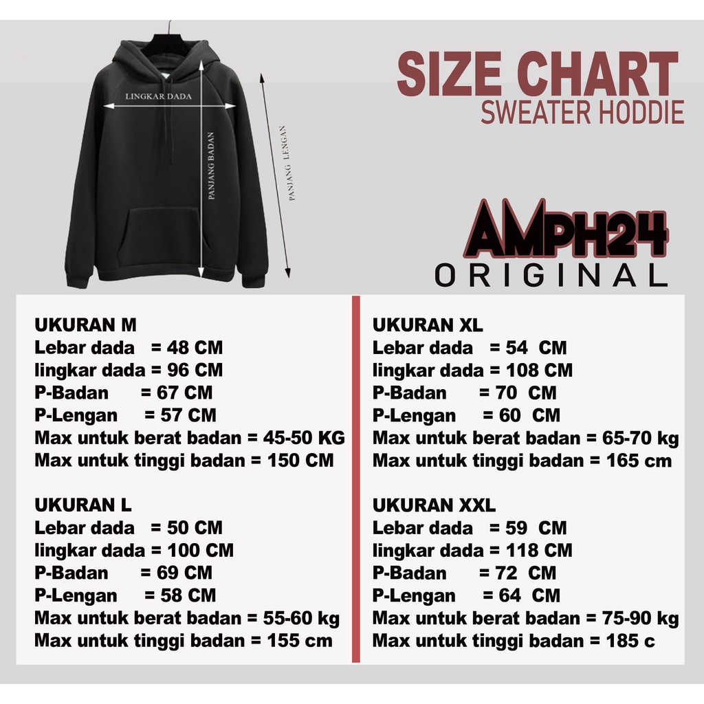 UKURAN L Lebar dada = 50 CM lingkar dada = 100 CM P-Badan = 69 CM P-Lengan = 58 CM Max untuk berat badan = 55-60 kg Max untuk tinggi badan = 155 cm