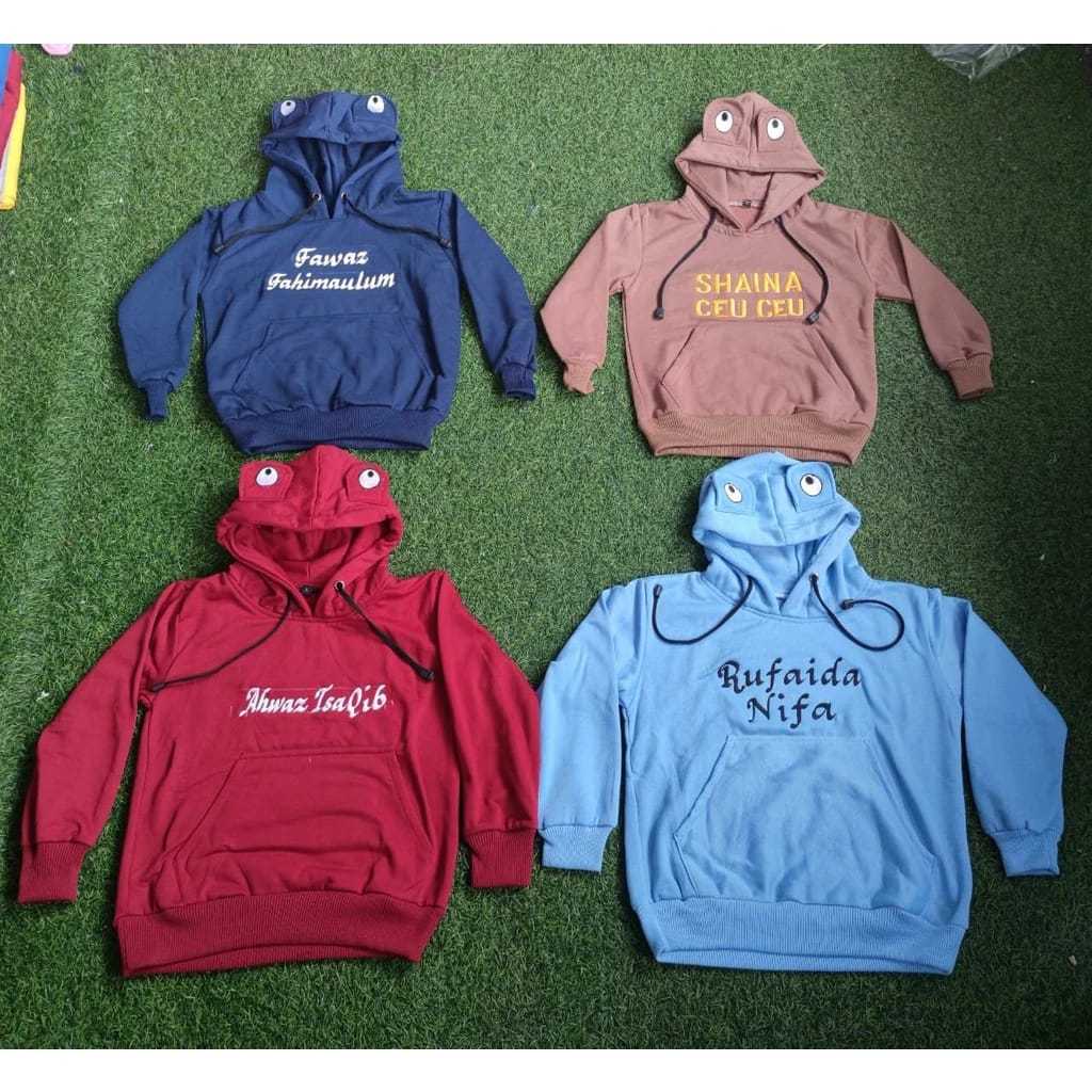 Deskripsi: Sweater Hoodie MATA Custom Anak dengan Request Bordir NAMA suka-suka Usia 1 Thn -11 Thn Tampil stylish,trendy dan nyaman dengan produk kami,cocok dipakai oleh Anak Laki-Laki maupun Anak Perempuan kapanpun dimana pun.