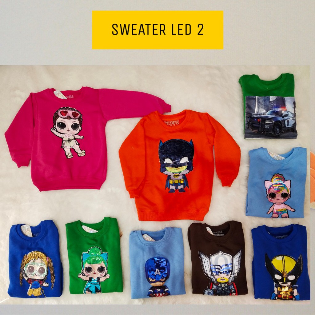 Sweater LED anak 🌸 Warna dan gambar Random / tidak bisa pilih 🌸 warna dan gambar banyak banget yg di foto hanya sample 🌸 bahan plece tebal 🌸 LED 1 lampu 🌸 LED tidak akan mati jika dicuci 🌸 estimasi buat 1 smpe 5tahun 🌸Size 2 4 6