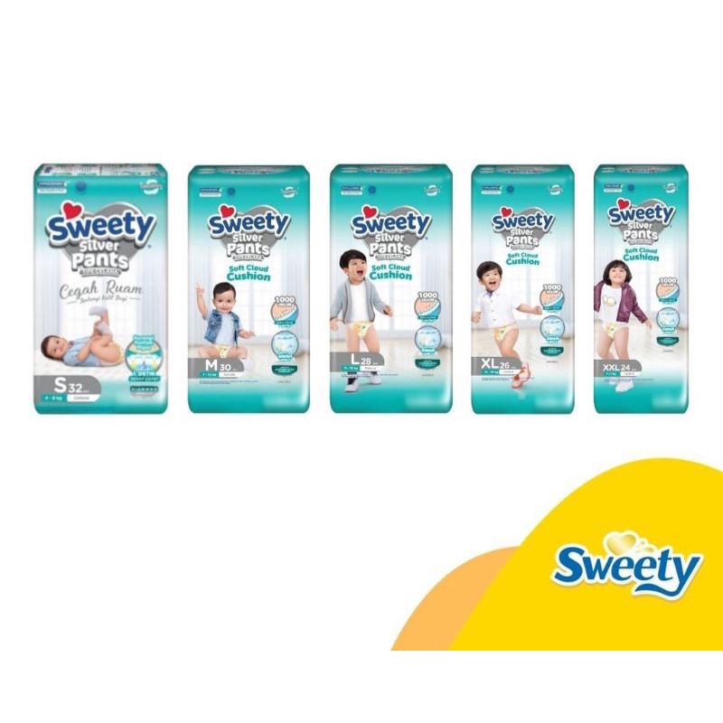 Sweety Silver Pants S32/M30/L28/XL26/XXL24 Popok tipe celana untuk si Kecil yang mulai aktif menendang-nendang serta aktif bergerak. Dilengkapi Diamond Layer Technology yang mampu menyerap pipis hanya dalam 1 Detik. Menjaga kulit si Kecil tetap kering dan sehat. 5 Dimensional Layer mendistribusikan & menyerap cairan ekstra cepat hanya dalam 1 detik5 Dimensional Layer mendistribusikan & menyerap cairan ekstra cepat hanya dalam 1 detik..5 Dimensional Layer mendistribusikan & menyerap cairan ekstra cepat hanya dalam 1 detik.Bahan lebih lembut untuk mencegah iritasi pada kulit bayi.Menyerap hingga 12 jam dengan jumlah urin normal bayi - 1-2mL/KgBB/Jam. Kulit bebas bernafas untuk mencegah iritasi pada kulit bayi.Pelembab Natural Lidah Buaya Melindungi kulit bayi dari kekeringan dan iritasi
