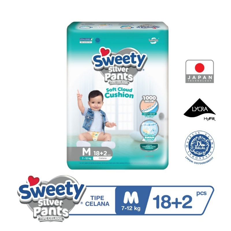 Sweety Silver Pants merupakan popok celana pertama dan satu-satunya di Indonesia dengan teknologi Diamond Layer (bermotif berlian), telah teruji klinis oleh Australian dermatologist, mengurangi resiko cairan bersentuhan dengan kulit bayi hingga 50%, Serta mendistribusikan dan menyerap cairan extra cepat, menjadikannya pilihan terbaik bagi para ibu dan bayi. Keunggulan popok celana Sweety Silver Pants: 1.Diamond Layer: Teknologi lapisan bermotif berlian yang menyerap cairan 1 detik mengurangi resiko cairan bersentuhan dengan kulit bayi 2.Soft Cotton Breathable: Bahan lapisan selembut kain dan bersirkulasi udara, mencegah kelembapan pada bayi 3.Natural Aloe Vera Moisturizer: Melindungi kulit bayi dari kekeringan dan iritasi 4.Slim Comfort Design: popok yang lebih tipis, pas di badan bayi, lebih nyaman dipakai 5.Ekstra Elastis dan Lembut: Karet pinggang dan lingkar paha yang ekstra elastis dan lembut. Tidak meninggalkan bekas kemerahan atau iritasi 6.Wider Back Side: Bagian belakang popok bayi lebih lebar dan menutup pantat bayi sehingga lebih nyaman 7.Bacteria Controlled: Sweety kini hadir dengan bacterial controlled mencegah tumbuhnya bakteri agar kulit sehat si kecil tetap terjaga 8.360 derajat Leak Guard Protection: Mencegah kebocoran dari segala sisi saat bayi beraktifitas