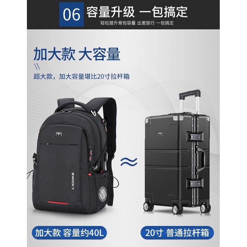 Specification Brand: SWICKY Product Name: Travel Leisure Business Laptop Backpack Product Model: 81669 LARGE Size Capacity: Up to 40L Main Material: Polyester Waterproof Material: High-Density Water-Repellent Fabric